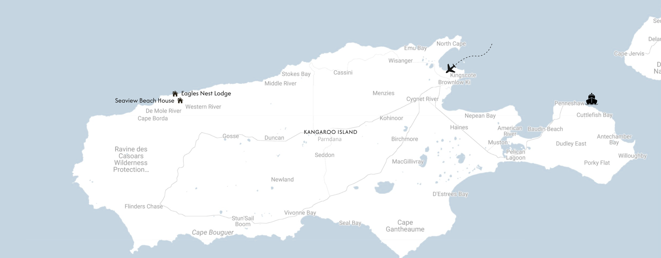From Penneshaw or Kingscote, allow approximately 1.5 hours drive to reach our properties. To find your way, simply enter ‘The full address given on your booking confirmation’ into Google Maps, ensuring an easy, direct route to your destination